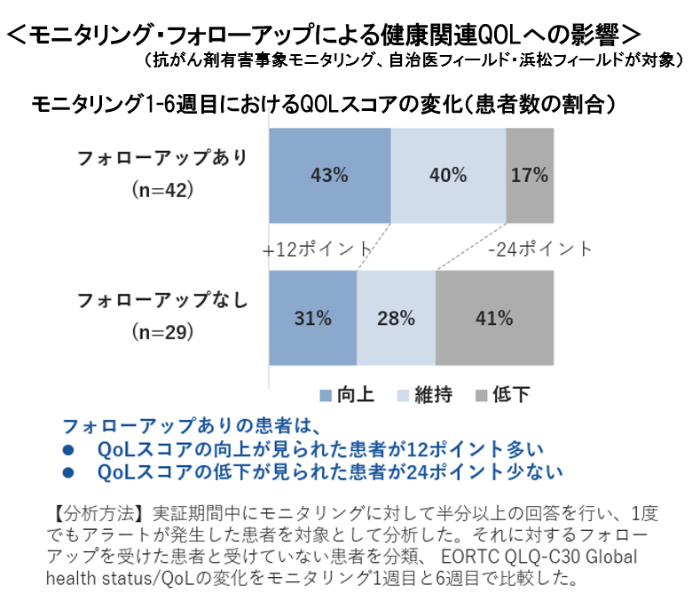 がん治療では、有害事象によって患者さんのQOLが低下しやすい傾向にありますが、「Pocket Musubi」を一部発展させたツールでフォローアップを実施した患者群は、フォローアップを受けなかったグループと比較してQOLの低下率が低く、改善傾向が見られました。治療に伴う不安などの有害事象をタイムリーに検知し、サポートを行うことで、患者さんの安心感などに寄与できたと考えています。