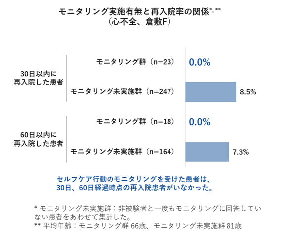 その結果、「Pocket Musubi」で継続的にモニタリングした患者群では、30日および60日後の再入院者はいませんでした。(※)心不全は再増悪を起こしやすい疾患ですが、服薬管理や体調変化のモニタリングを通じて、悪化の兆候を早期に捉え、適切な医療介入を促すことで、患者さんの自宅での安定した生活をサポートする一助となる可能性が示されました。