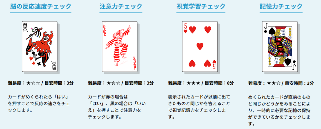 測定項目は、記憶・注意・判断・反応速度の4つ。トランプカードを使った測定にゲーム感覚でトライすることができ、所要時間は約15分です。測定終了後には「集中力」「記憶力」がABCの3段階と、「脳年齢」結果が表示されます。これらの結果は同年代との比較で提示されるため、自身の認知機能の状態を客観的に把握でき、利用者の脳の健康意識の向上に寄与する仕組みです。