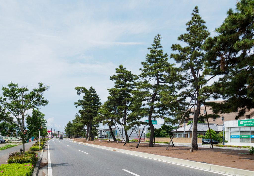 そこで、当社が持つ特殊機械を用いたTPM工法により、これらの松を「伐採」することなく、道路沿いの新たな位置へ移植する計画を提案。松は移植が非常に難しく、根を切ることで枯れるリスクが高い樹木ですが、独自の技術により、枝ぶりを大きく変えることなく、移植させることができました。
