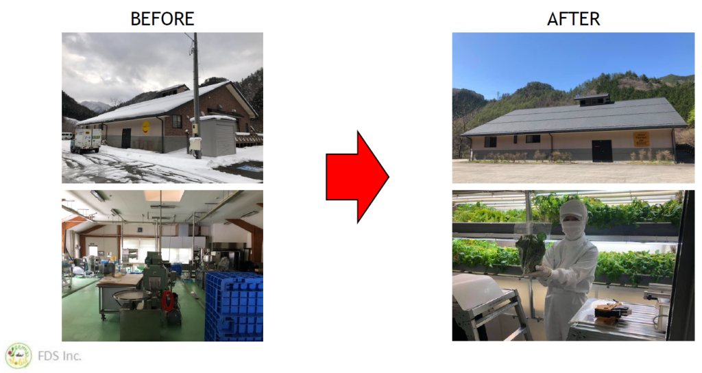 岐阜県高山市にて、第三セクターで作られた閉鎖済みの食品加工場を完全閉鎖人工光型植物工場として再生しました。これにより、冬場に農業生産ができず過疎化が進む地域において、雇用創出と地域活性化に成功しました。「Mottainai」をモットーに、廃校などの遊休公共施設を地域の新たな価値創造拠点に変える事例です。